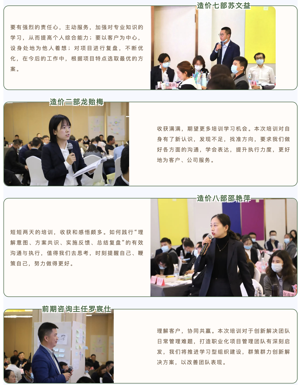随着建筑业的高速发展,云岭咨询也在顺势转型升级,新的咨询业务布局对人才的需求和发展提出了更高的要求,人才是云岭咨询核心竞争力。清代哲学家颜元说过“心中醒、口中说、纸上做、不从身上习过,皆无用也”,为期两天紧张、活泼的封闭学习结束了,知识点,工具、方法论我们学习到了,还需要长期的实践,经常性的总结,定期的复盘,让这些知识成为我们无意识的身法言行。让我们真正破茧而出,有效沟通!